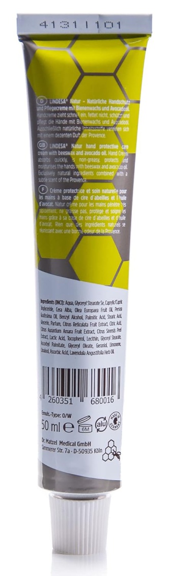 Die LINDESA Natur Pflegecreme ist eine rein natürliche Handschutz- und Pflegecreme mit Bienenwachs und Avocadoöl. Die Kombination aus rein natürlichen Inhaltsstoffen mit schützendem Bienenwachs, pflegendem Avocadoöl und beruhigendem Lavendelöl schützt und pflegt die Hände. Die Creme zieht schnell ein, ohne nachhaltig zu fetten oder das Tastgefühl zu beeinträchtigen. Die LINDESA Natur Pflegecreme stärkt die Abwehrfunktion der Haut, beugt Hautschädigungen durch äußere Belastungen vor und wirkt normalisierend auf gereizte Hautpartien